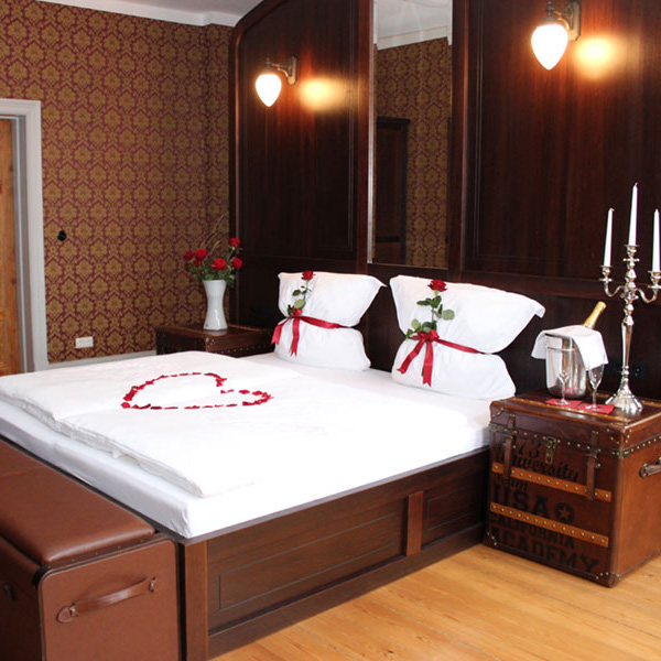 Für Ihre Hochzeitsfeier besteht die Möglichkeit das gesamte Gebäude zu belegen oder nur unseren Festsaal zu nutzen. Ganz wie Sie es wünschen und der Ablauf der geplanten Feier es zulassen. Weiterhin besteht die Möglichkeit eine charmant im Stil der goldenen 1920iger Jahre eingerichtete Hochzeitssuite für die Übernachtung nach der großen Feier zu nutzen.